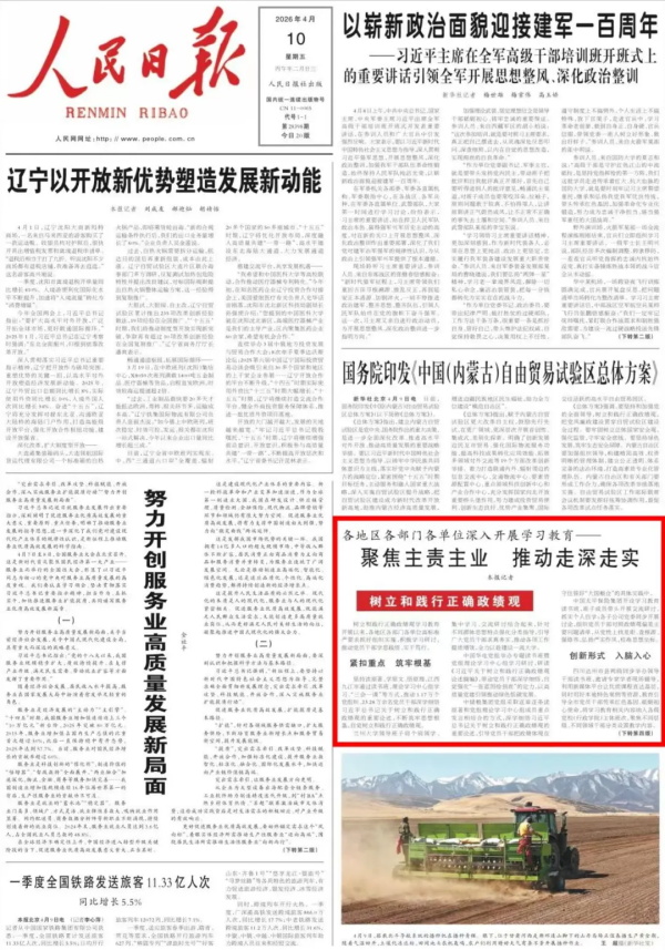 4月10日,《人民日报》头版刊发《各地区各部门各单位深入开展学习教育——聚焦主责主业 推动走深走实(树立和践行正确政绩观)》一文,报道了树立和践行正确政绩观学习教育开展以来,各地区各部门各单位高标准严要求抓好组织实施,积极学习研讨,推动党员干部学思践悟、实干笃行的实践。伟德体育官网一体推进学查改、以项目化清单化狠抓落实的做法被引用为案例之一。