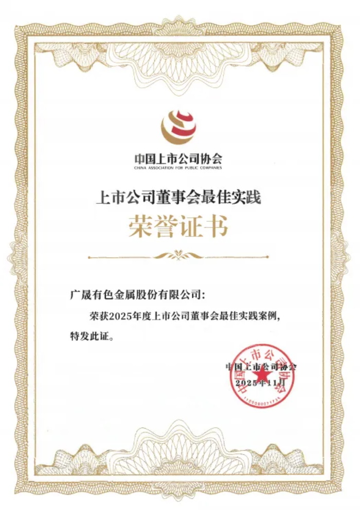 近日,中国上市公司协会正式公布“2025年上市公司董事会最佳实践创建活动”评选结果,广晟有色金属股份有限公司(简称“广晟有色”)凭借规范高效的治理实践,荣获“2025年上市公司董事会最佳实践案例”荣誉,彰显国资央企上市公司治理标杆实力。